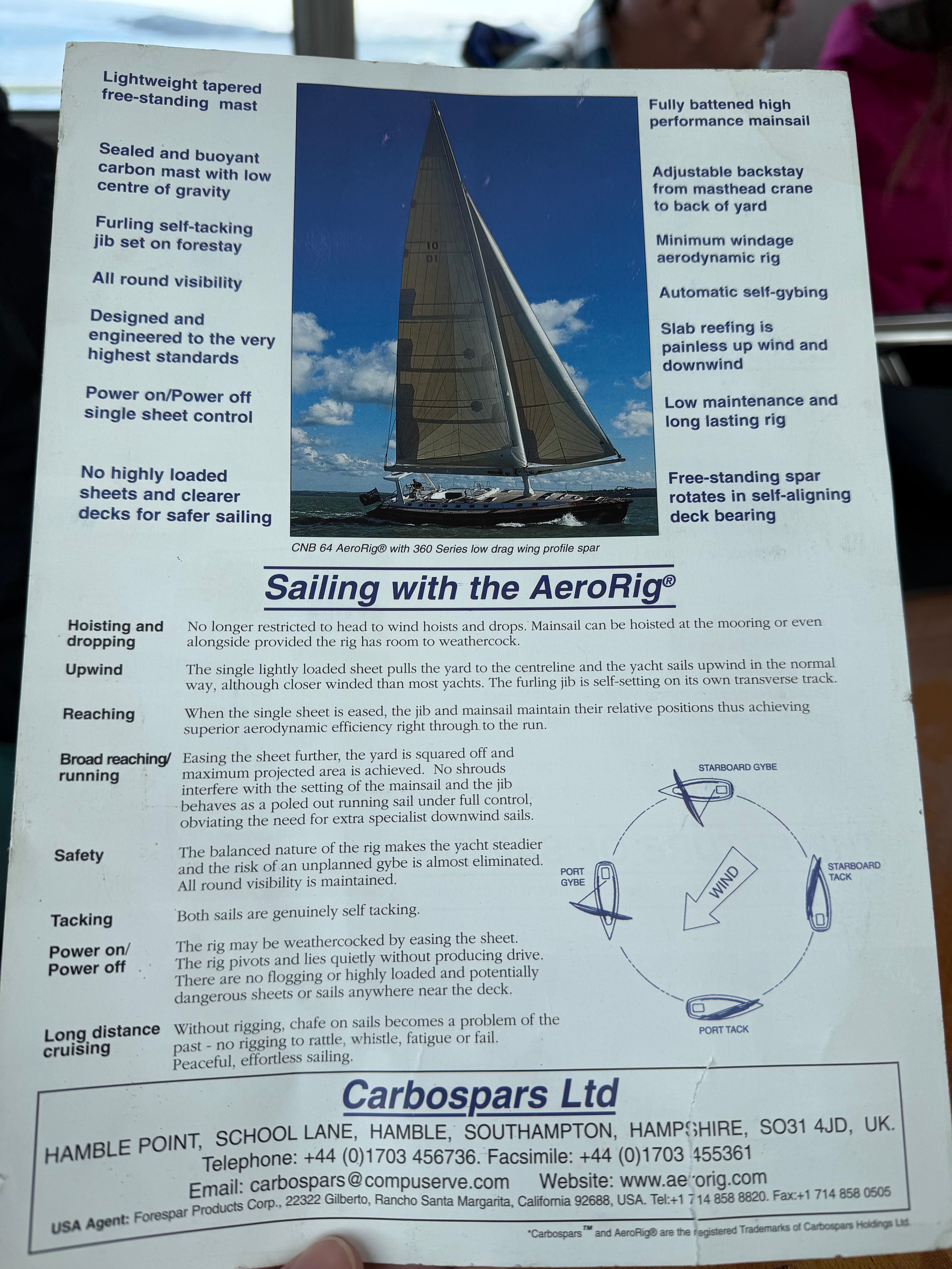 Ladybird (the boat we are on) has a unique mast/boom situation called an AeroRig. Here you can see part of the description of its benefits and how to use it.