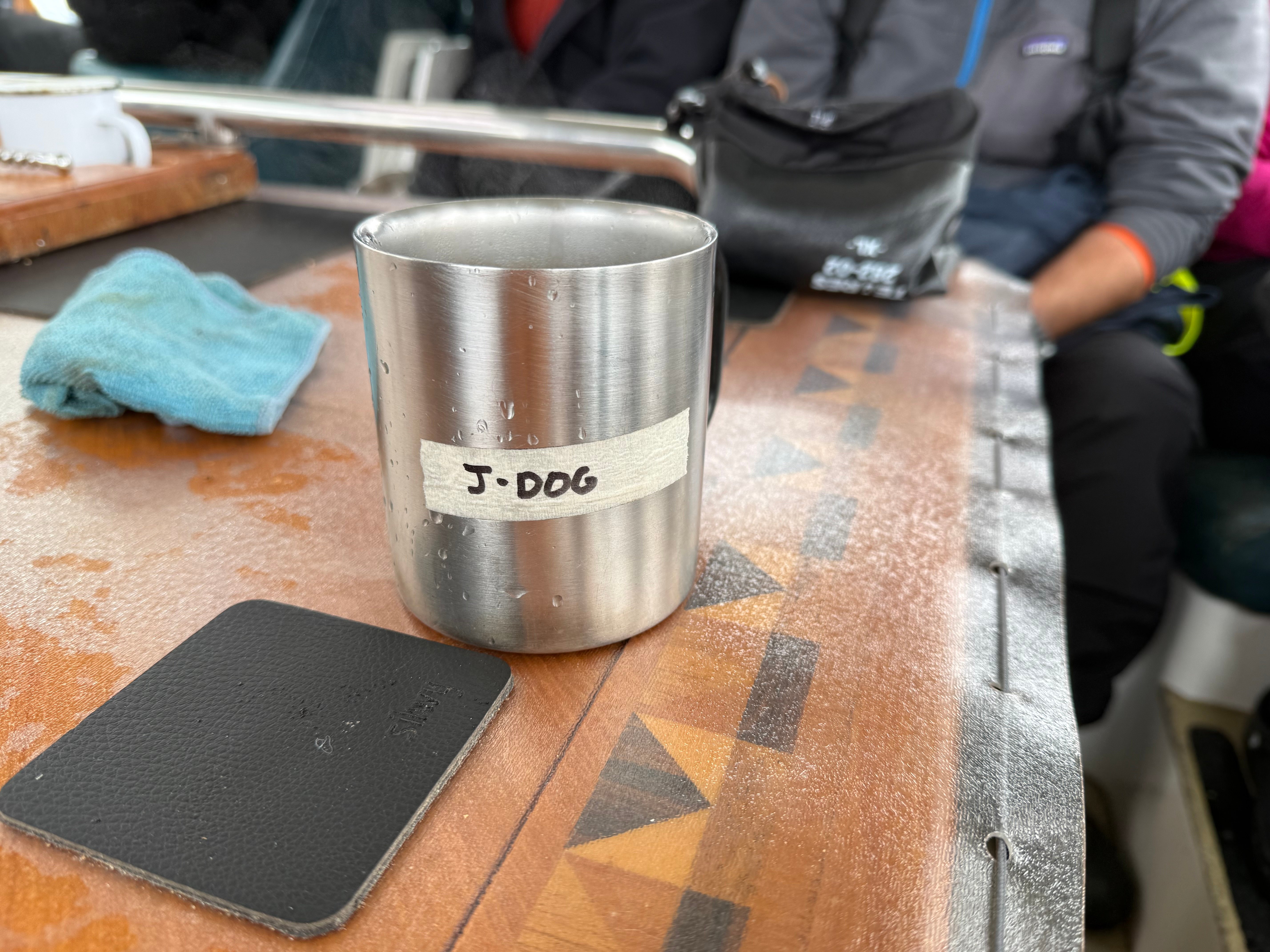 We labeled mugs on the boat use across the entire trip. Jason Wynn (having the best handwriting) was put in charge of labeling and picked "Jason #1" for himself. So rather than being "Jason #2" I asked to adopt my new nickname that Steve had given me. Increasing the stickage factor.