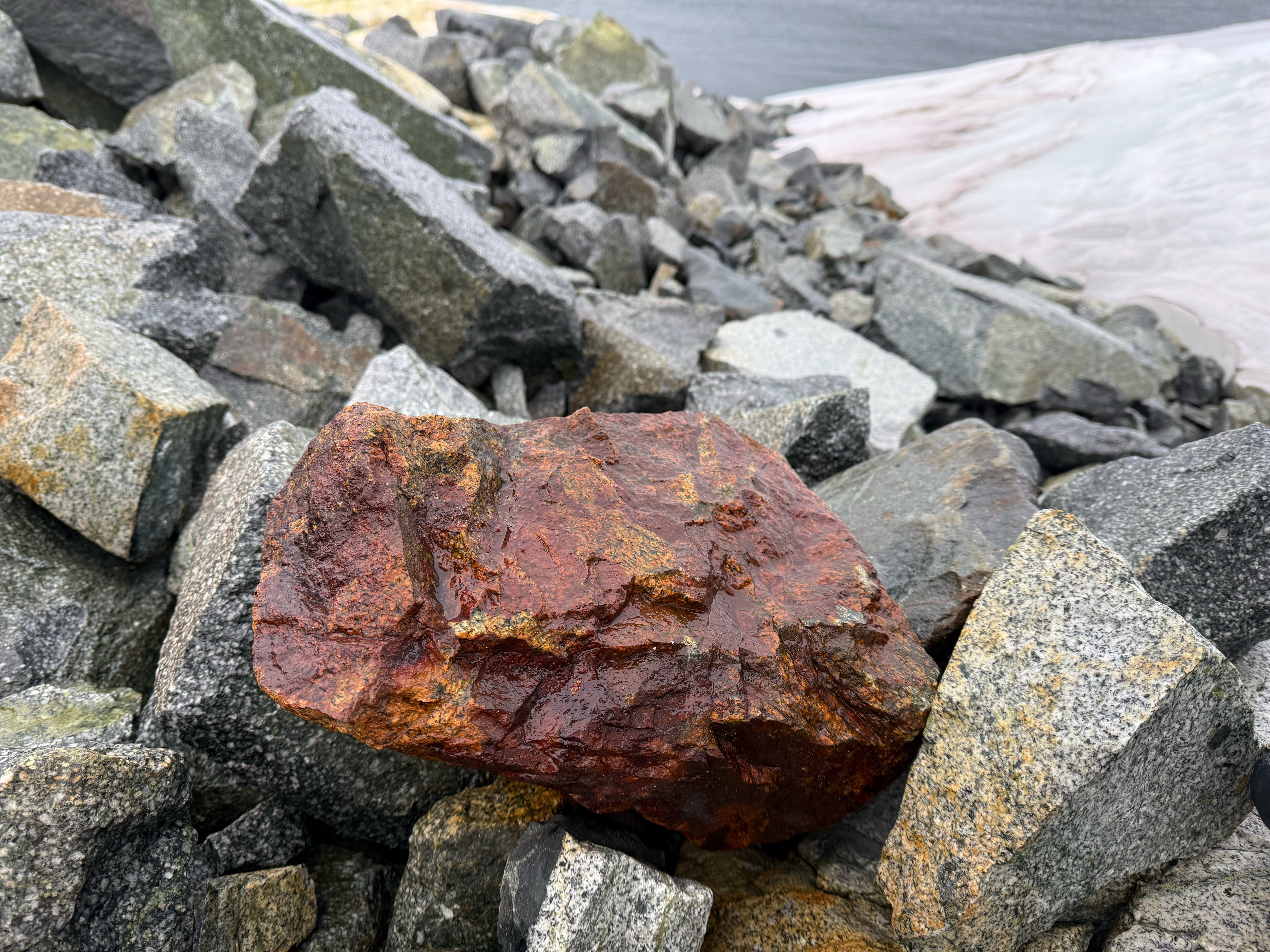 Every so once in a while you'd find these very red rocks. I assume it's a higher iron oxide content but it's weird thinking how they've been distributed by ice movements over millenia.