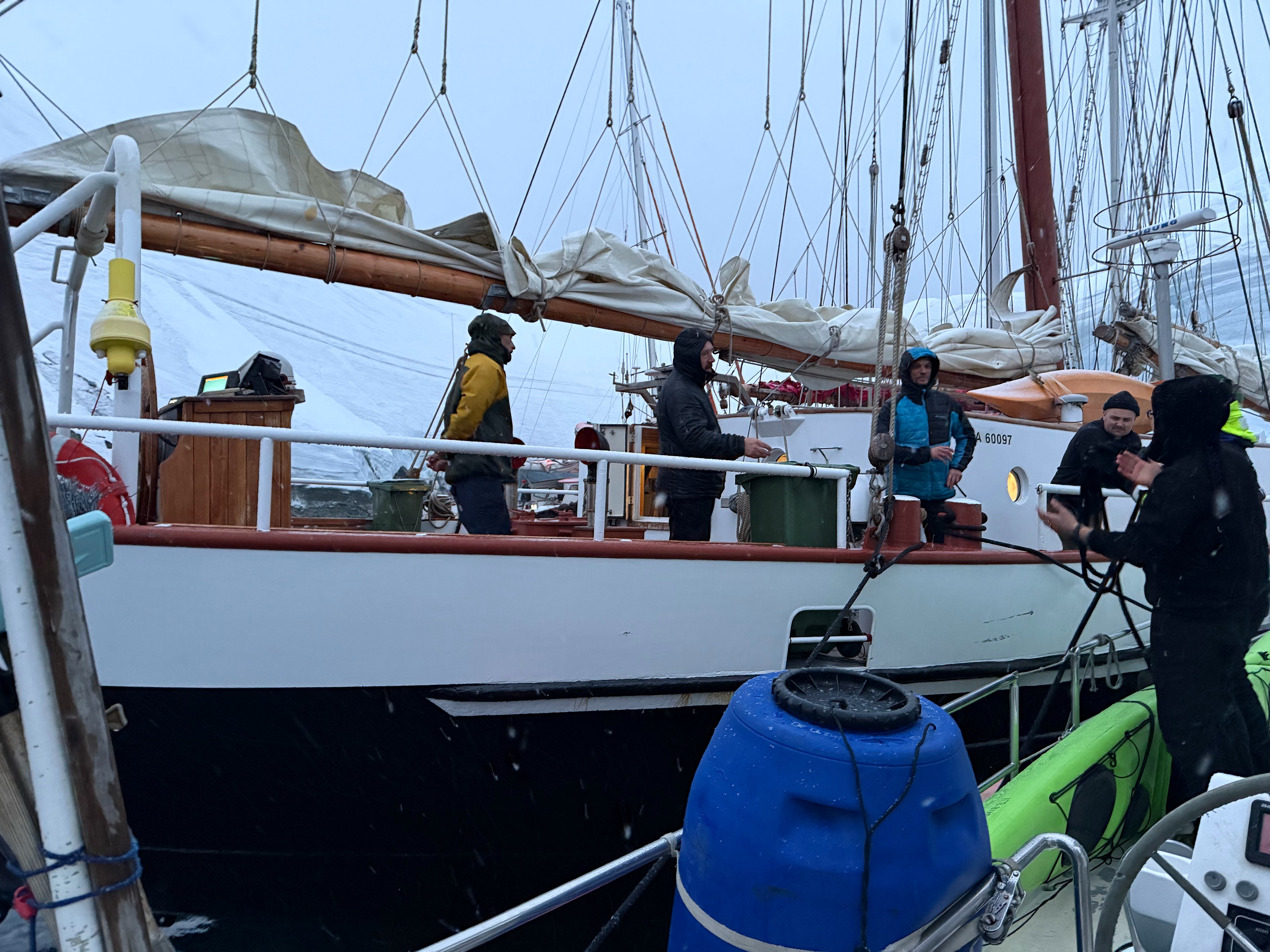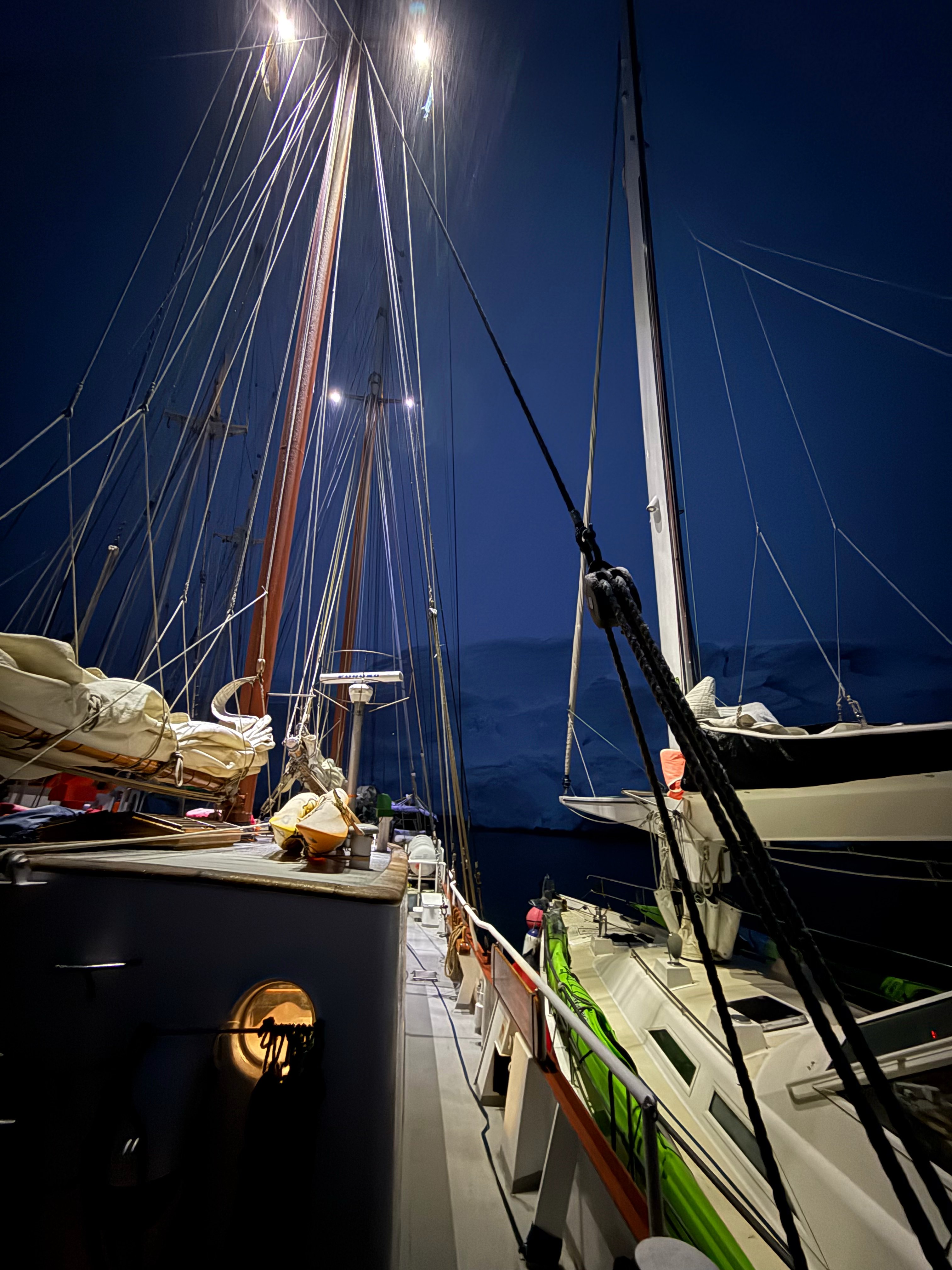 As we pulled up, I remember twilight setting in and a heavily overcast sky setting the mood as we went out to help with lines and see what we were tying up to. It started snowing.
